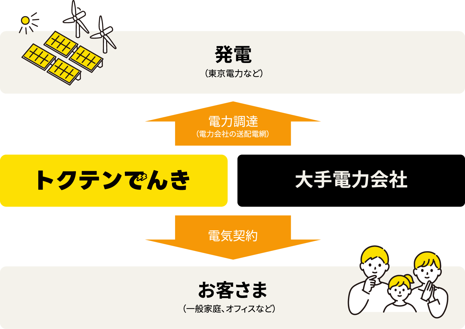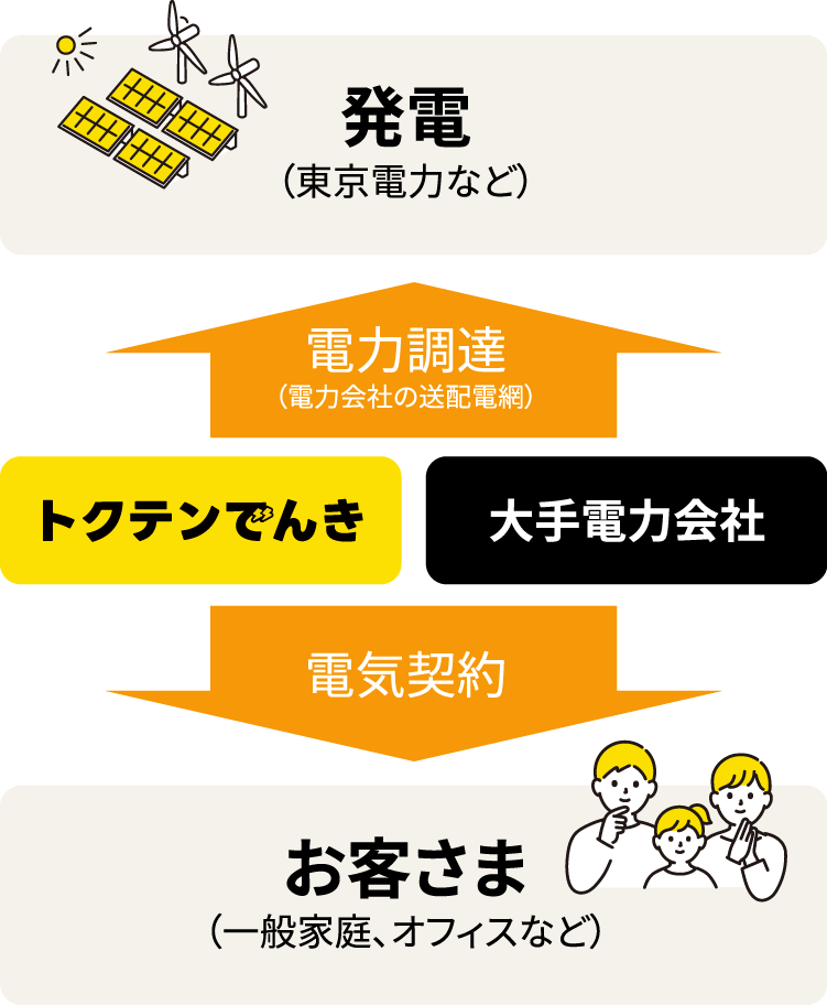 お客様がご使用になる電気は大手電力会社(地方電力会社)と同じ送電網を利用して供給されます。