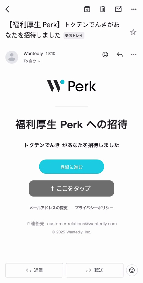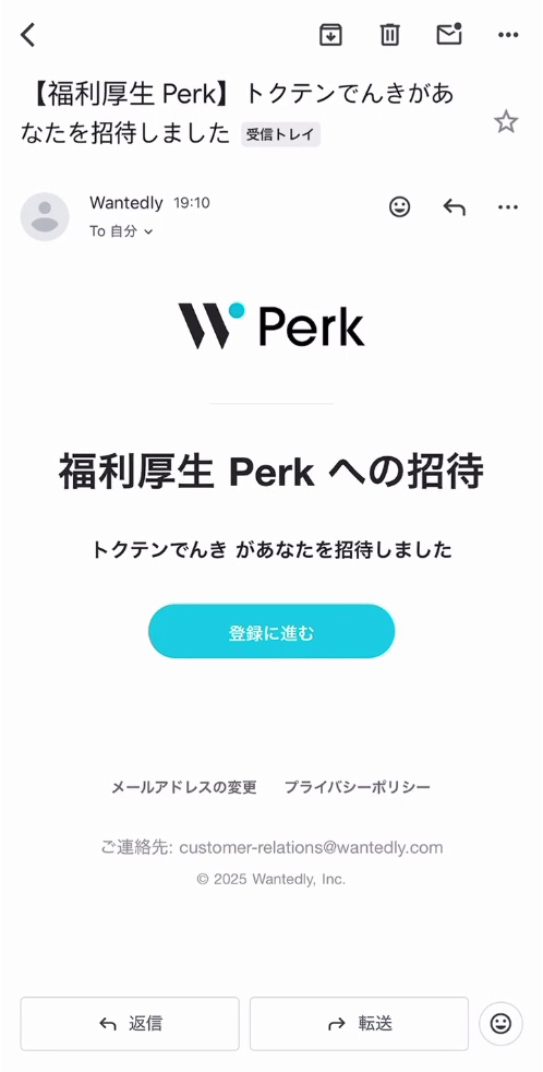 トクテンでんきから届いた「【福利厚生 Perk】トクテンでんきがあなたを招待しました」メールを開きます。