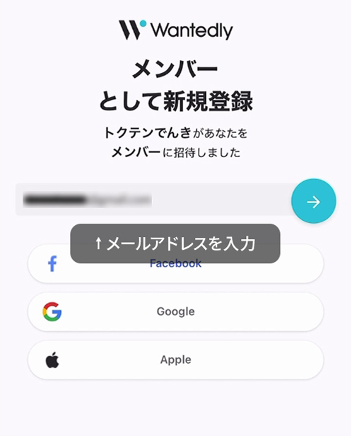 メンバーとして新規登録登録の画面で「メールアドレス」を入力し、「→」ボタンを選択します。