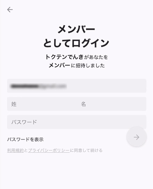 メンバーとしてログインの画面で「メールアドレス」「お名前」「パスワード」(8文字以上)を入力して、「→」を選択します。